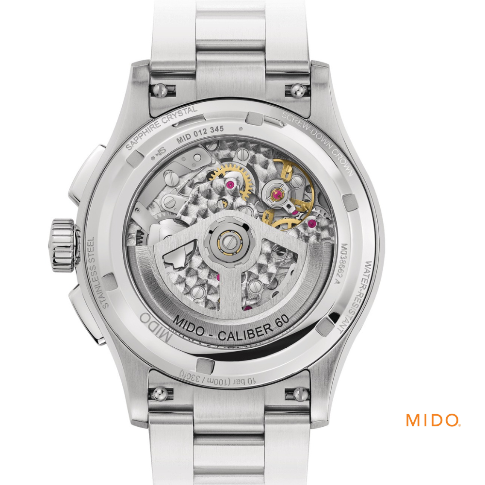 Đồng hồ Multifort Skeleton Chronograph là hiện thân đích thực của sự quý hiếm, công nghệ tiên tiến và tay nghề thủ công xuất chúng. Bộ máy tự động Thụy Sĩ tinh xảo và chính xác này là trái tim của chiếc đồng hồ thể thao này, với chức năng bấm giờ tiên tiến. Mặt số lộ cơ với các kim được chế tác tỉ mỉ, phô diễn sự phức tạp về mặt cơ học của đồng hồ, đồng thời đảm bảo khả năng đọc tối ưu qua kính sapphire, được phủ lớp chống phản quang ở cả hai mặt. Mặt sau trong suốt tôn lên vẻ đẹp của bộ máy bấm giờ lộ cơ tự động caliber 60 A05.951, được MIDO phát triển và ứng dụng lần đầu tiên. Bộ sưu tập Multifort. Khả năng chống nước 10 bar (100 m / 330 ft) với núm vặn vít. Trọng lượng (g) 196. Hình dạng vỏ: Tròn. Chất liệu vỏ: Thép không gỉ. Pha lê: Tinh thể sapphire được xử lý chống phản chiếu hai mặt. Các tùy chọn vỏ: Mặt sau trong suốt, Núm vặn vặn chặt. Chiều dài vỏ (mm) 43,00. Chiều rộng (mm) 43,00. Độ dày trung bình (mm) 14,4. Chiều rộng càng nối dây (mm) 22,00. Màu mặt số: Than chì. Bộ máy: MIDO Automatic ETA. Chức năng: Chronograph, Kim giây nhỏ. Dự trữ năng lượng: Dự trữ năng lượng lên đến 60 giờ. Mã tham chiếu dây đeo: M605019467. Chi tiết dây đeo: Thép không gỉ. Màu dây đeo: Xám. Khóa: Khóa gập