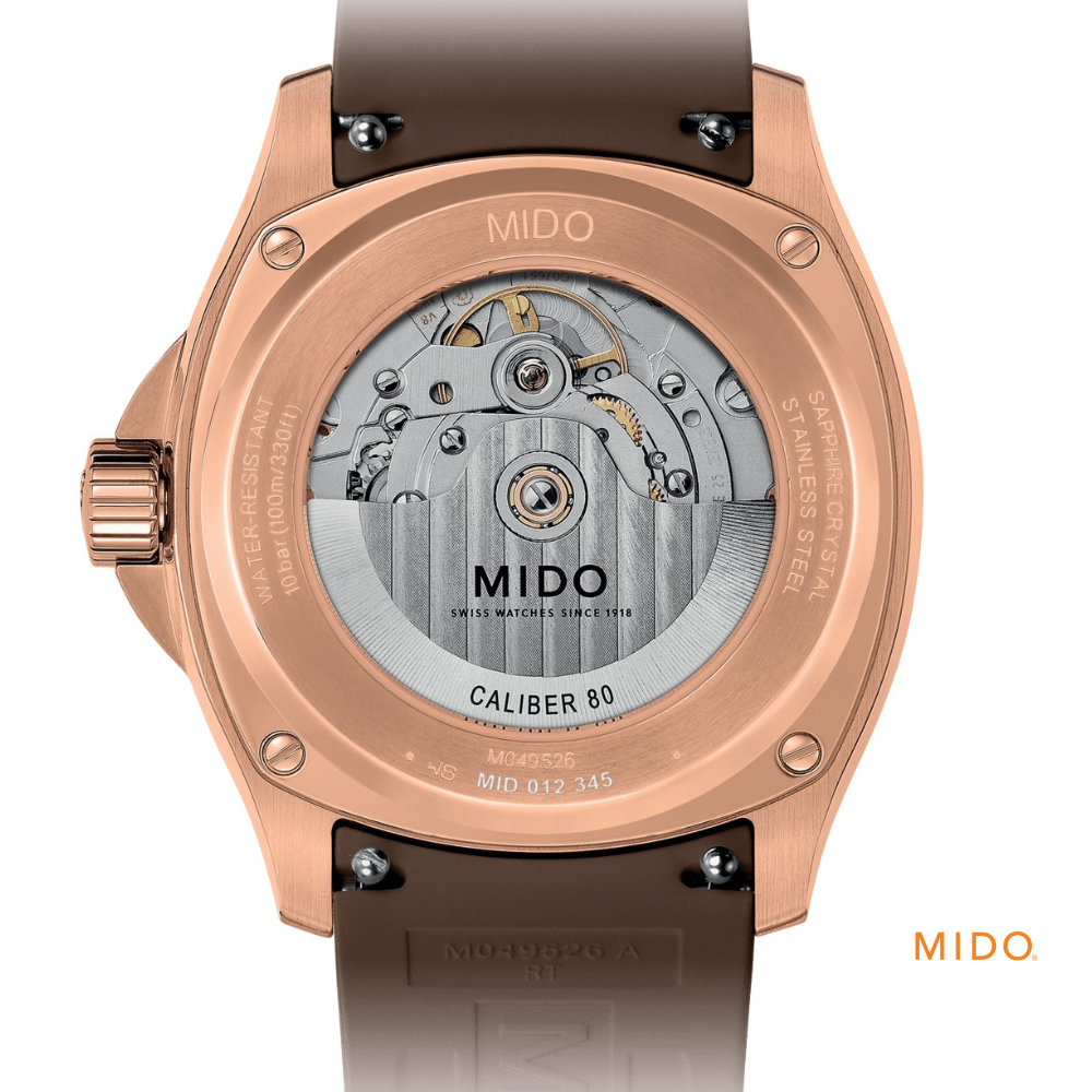 Một hồi tưởng tuyệt vời! Ra đời từ di sản phi thường của MIDO, vỏ máy hình TV trở lại vị trí trung tâm của Multifort TV Big Date, vừa mạnh mẽ vừa chính xác, nhờ bộ máy cơ học đáng gờm. Thiết kế hiện đại và năng động của chiếc đồng hồ Thụy Sĩ này được nhấn mạnh bởi mặt số chải xước ngang nổi bật và chức năng đặc trưng: BIG DATE ở vị trí 12 giờ. Bộ máy tự động thế hệ mới nhất đáng gờm, Calibre 80 được trang bị lò xo cân bằng công nghệ cao làm từ Nivachron™, mang lại khả năng chống va đập và từ trường vượt trội. Bộ sưu tập Multifort. Khả năng chống nước 10 bar (100 m / 330 ft) với núm vặn vít. Trọng lượng (g) 100. Hình dạng vỏ Hình chữ nhật. Chất liệu vỏ Thép không gỉ phủ PVD màu vàng hồng. Pha lê Tinh thể sapphire được xử lý chống phản chiếu hai mặt. Tùy chọn vỏ Mặt sau trong suốt, núm vặn vít xuống. Chiều dài vỏ (mm) 39,20. Chiều rộng (mm) 40,00. Độ dày trung bình (mm) 11,5. Chiều rộng vấu (mm) 22,00. Màu mặt số Nâu. Bộ máy MIDO Tự động ETA. Chức năng Ngày lớn. Dự trữ năng lượng Dự trữ năng lượng lên đến 80 giờ. Mã tham chiếu dây đeo/xích M603019218. Dây đeo phía trước bằng chất liệu tổng hợp. Dây đeo phía sau bằng chất liệu tổng hợp. Chi tiết dây đeo Cao su. Màu dây đeo: Nâu. Khóa: Khóa cài
